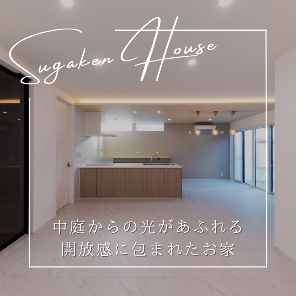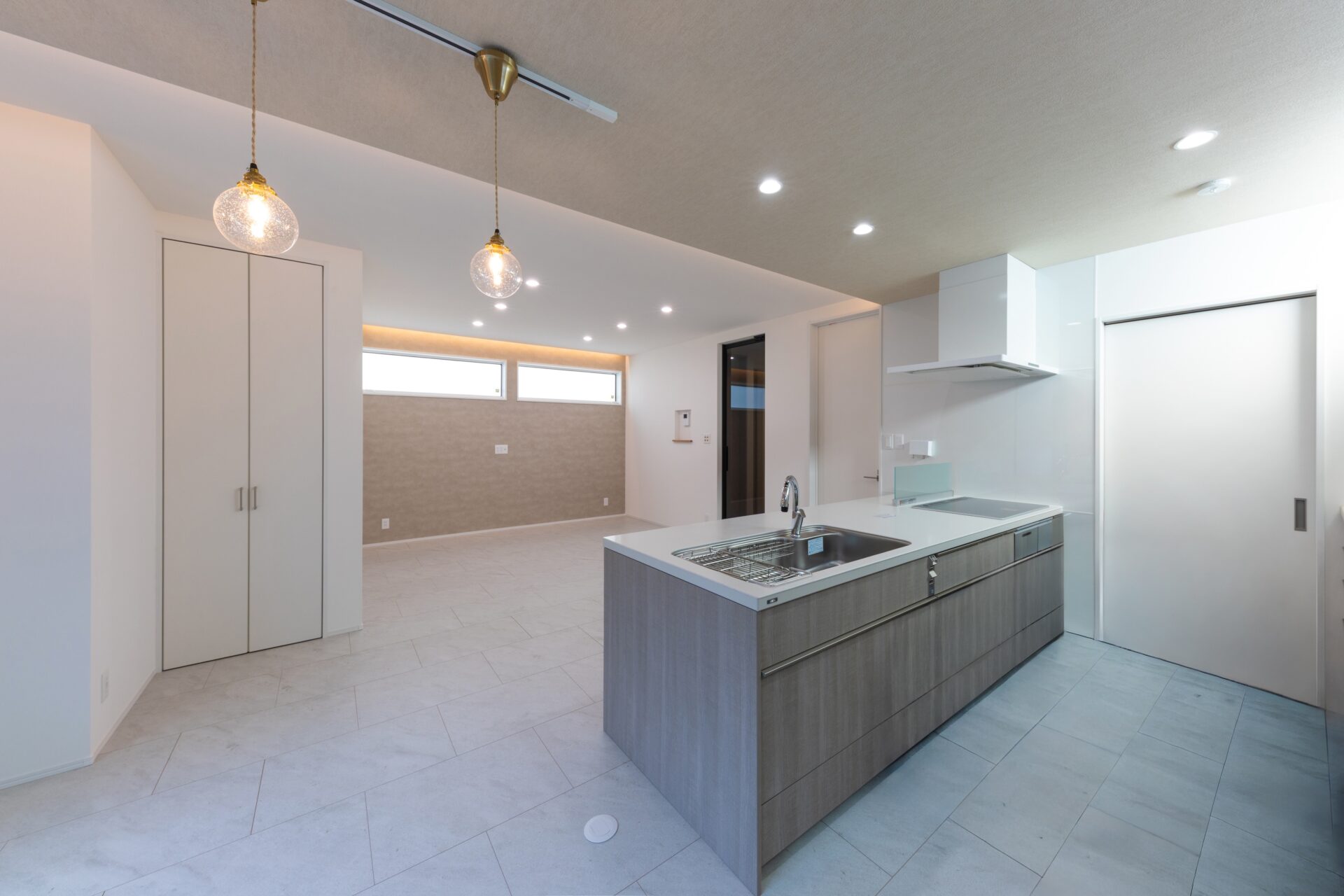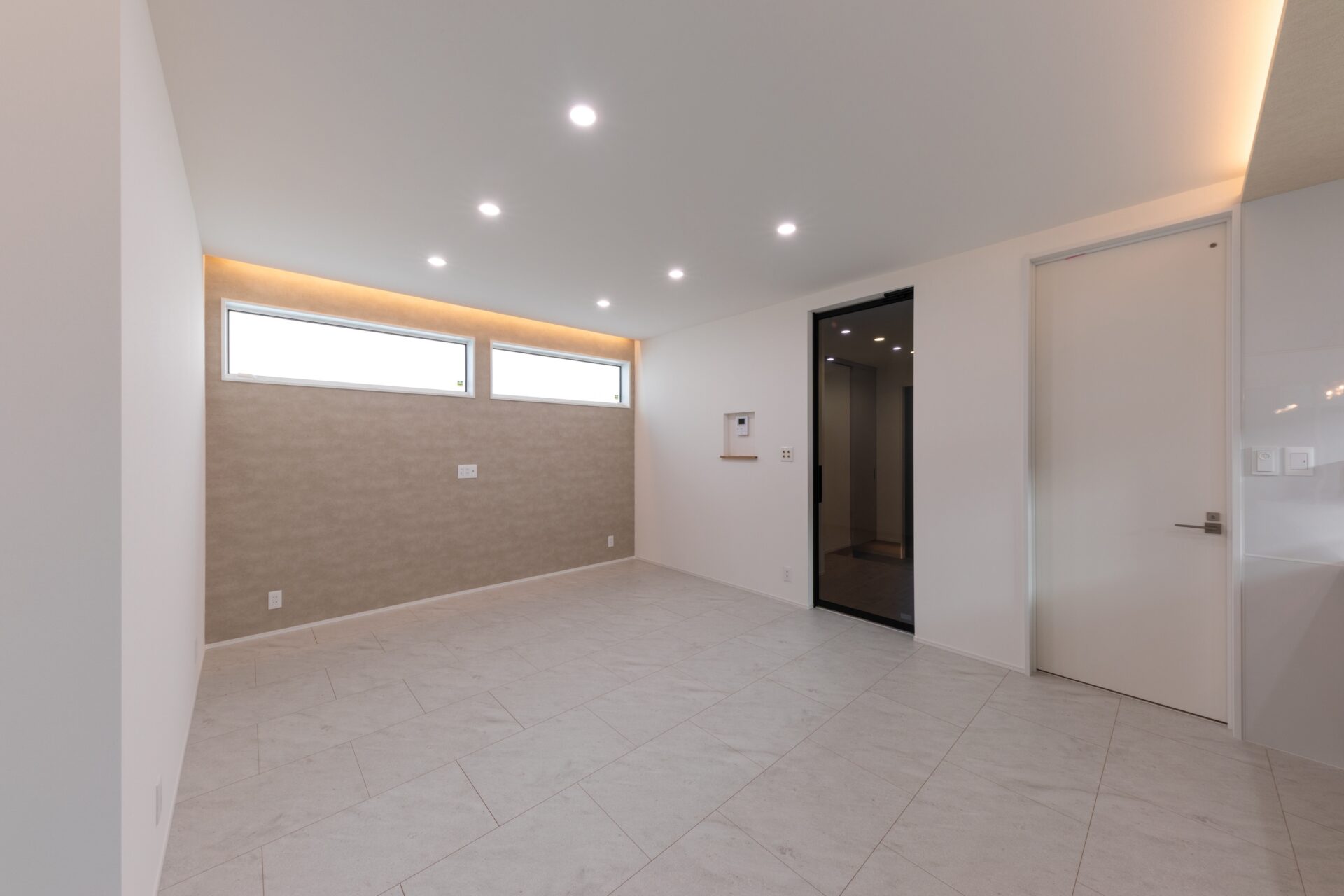| 中庭からの光があふれる開放感に包まれたお家 スタイリッシュ・モダンな白×グレー、タイル調のLDKフロアがポイントです | |