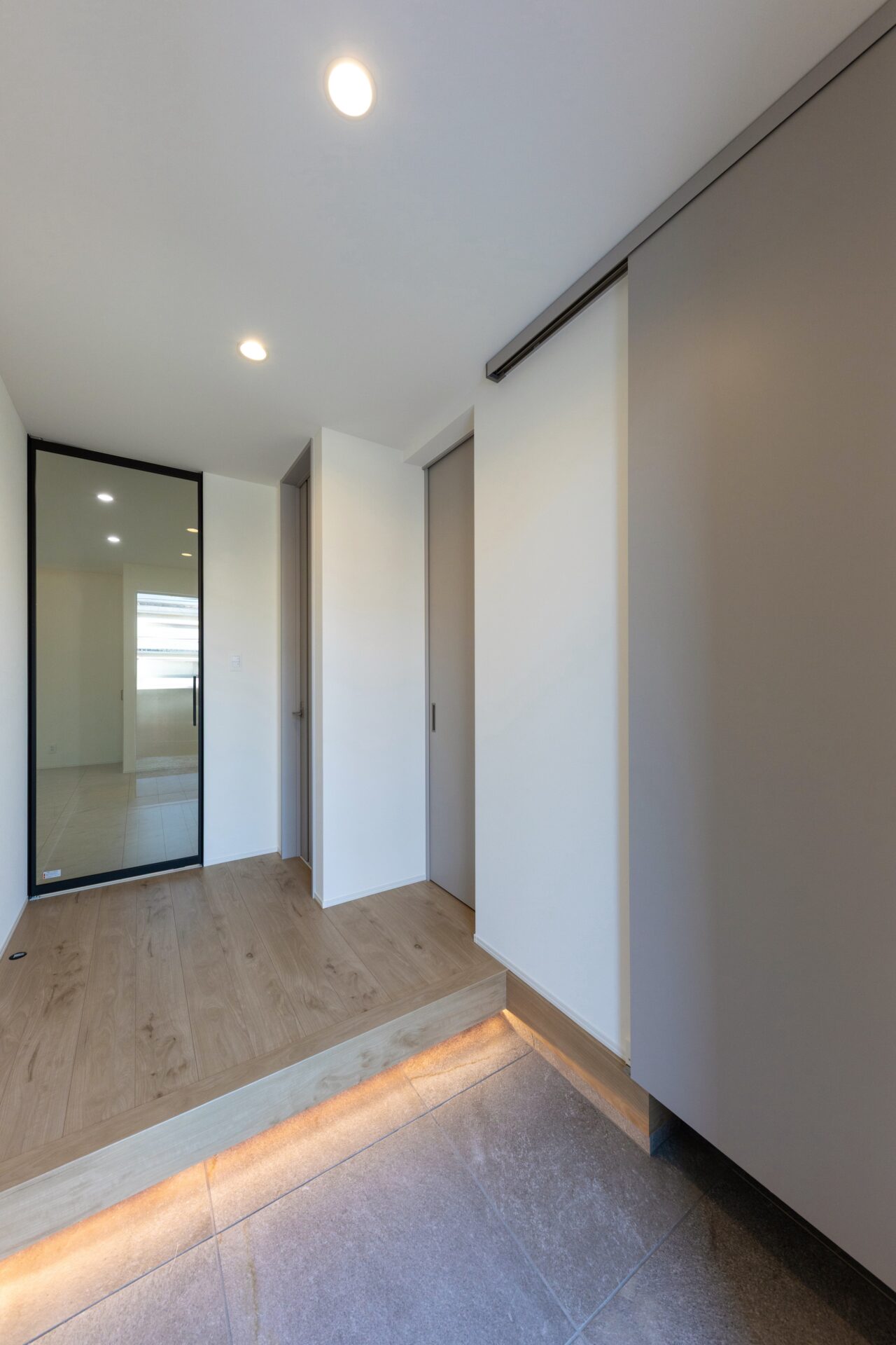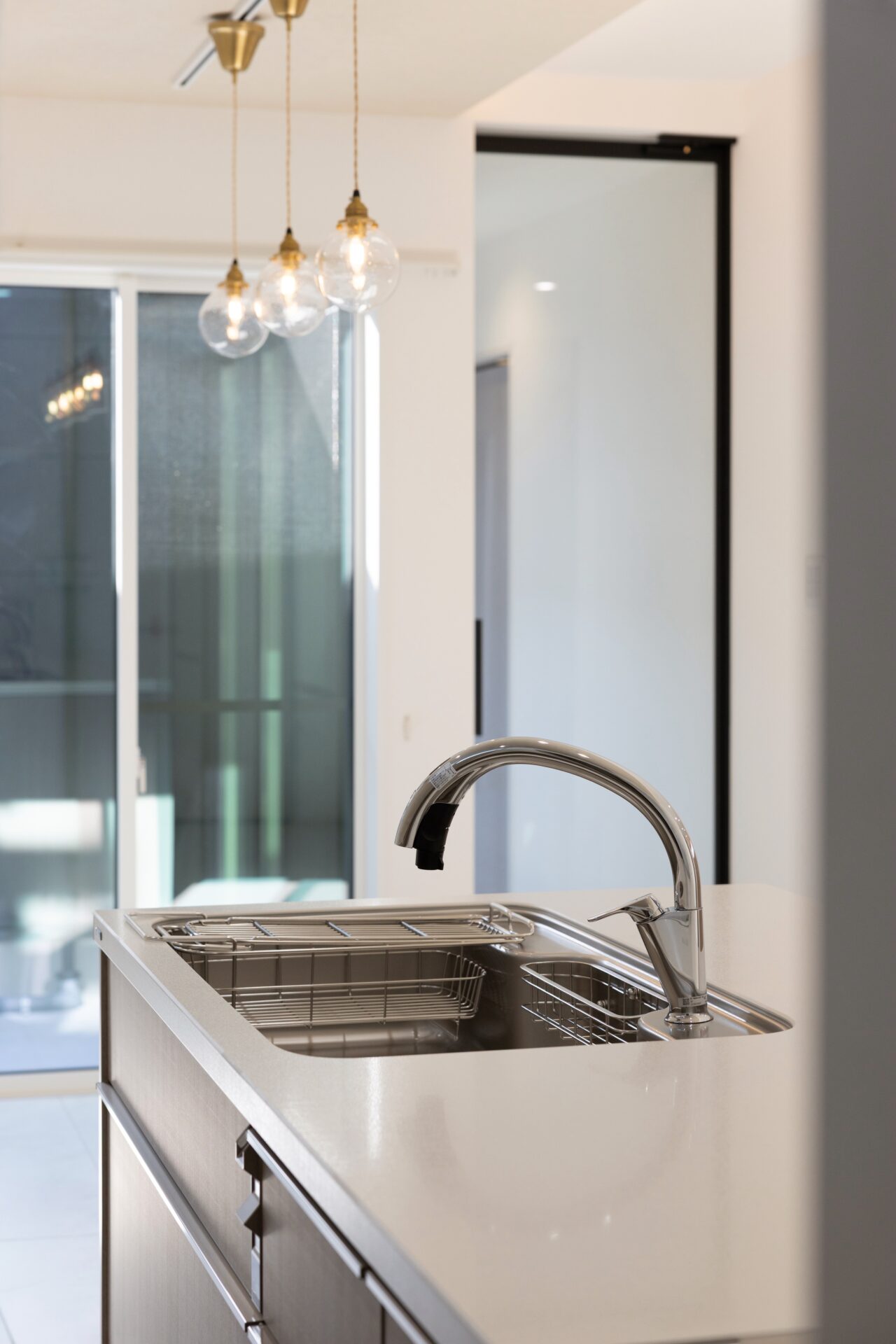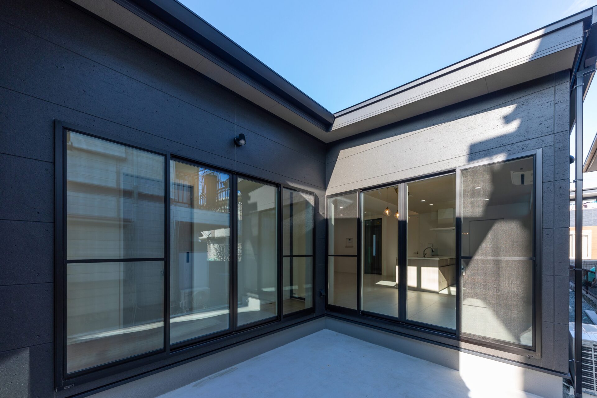| 中庭からの光があふれる開放感に包まれたお家 スタイリッシュ・モダンな白×グレー、タイル調のLDKフロアがポイントです | |