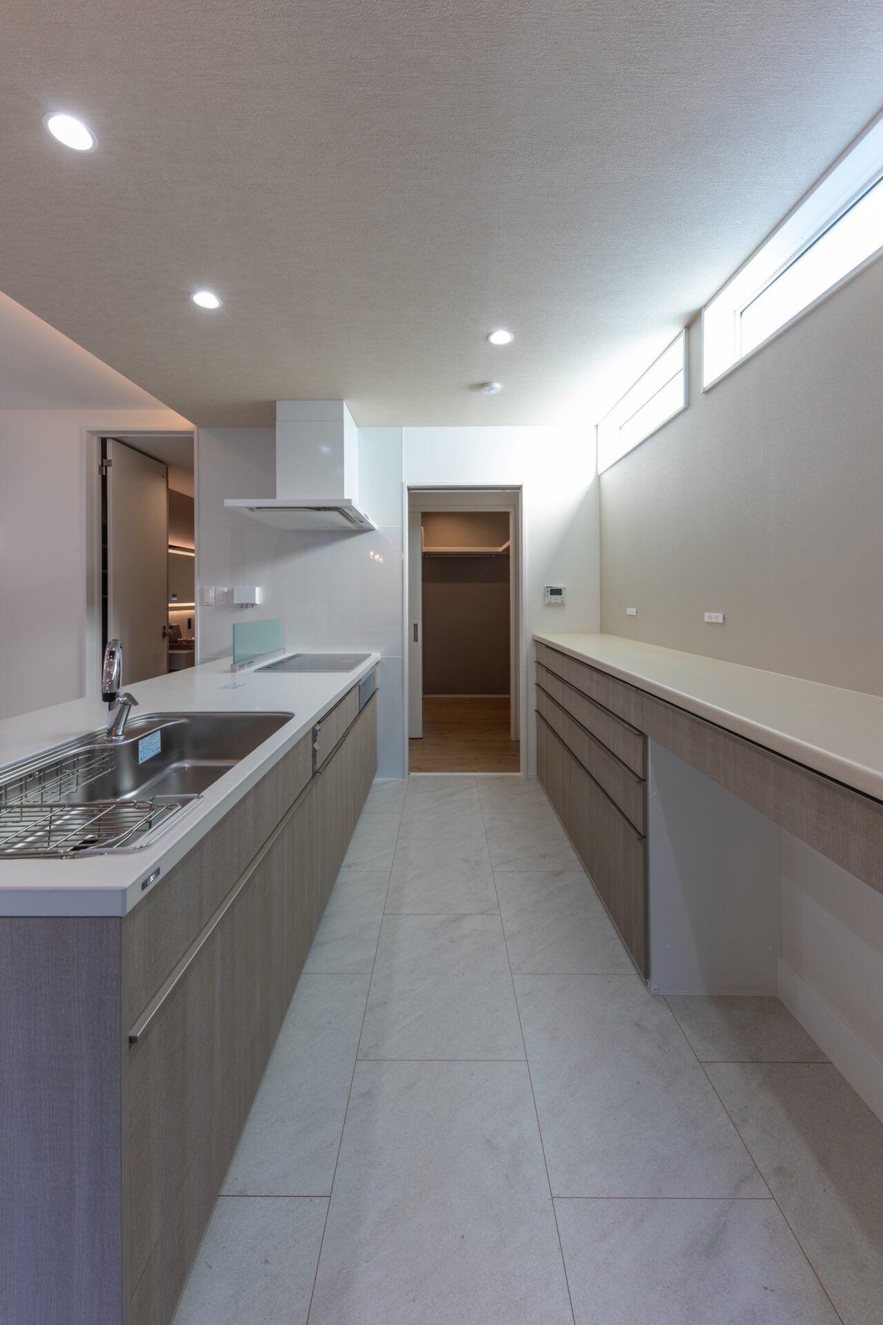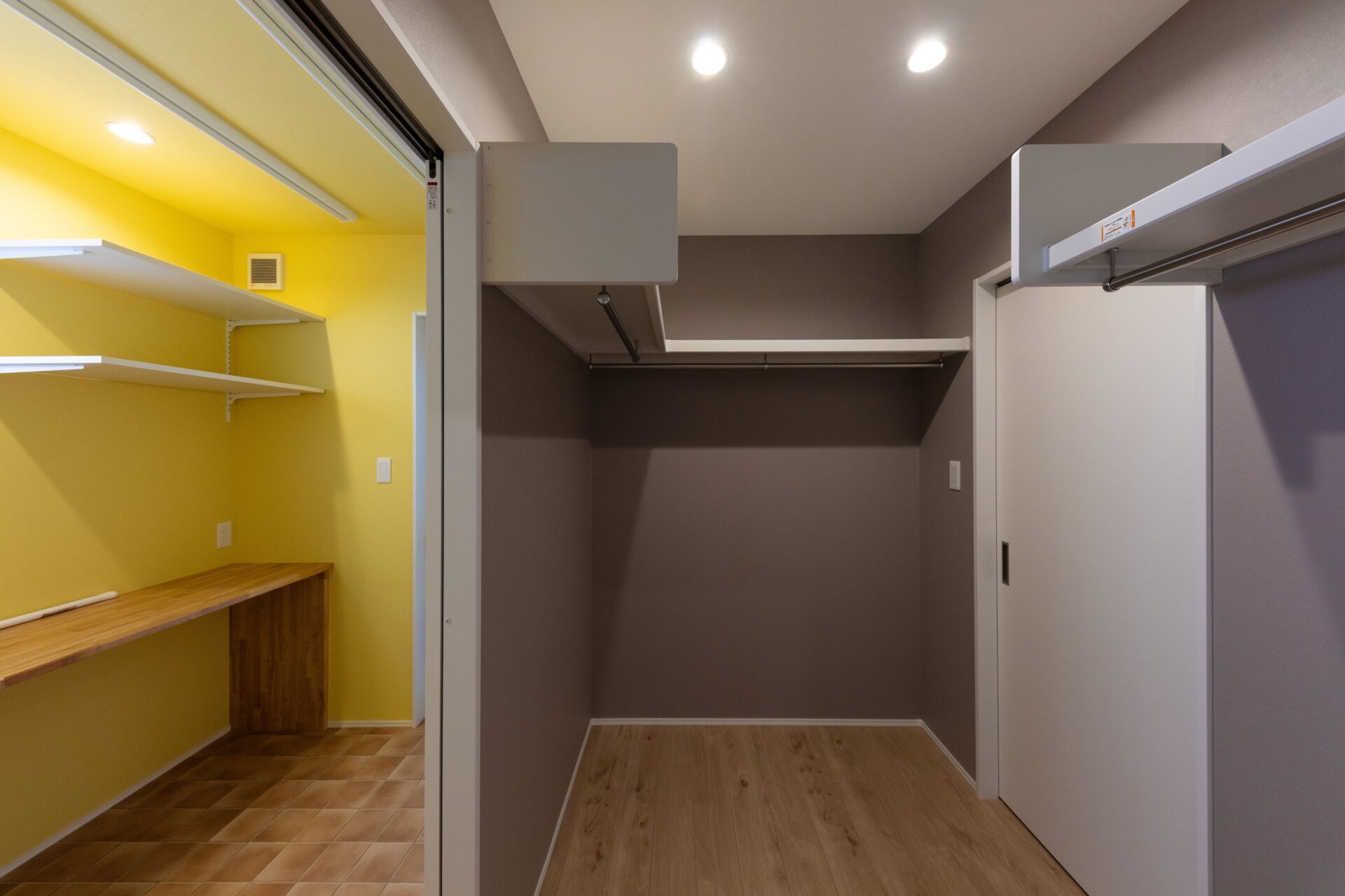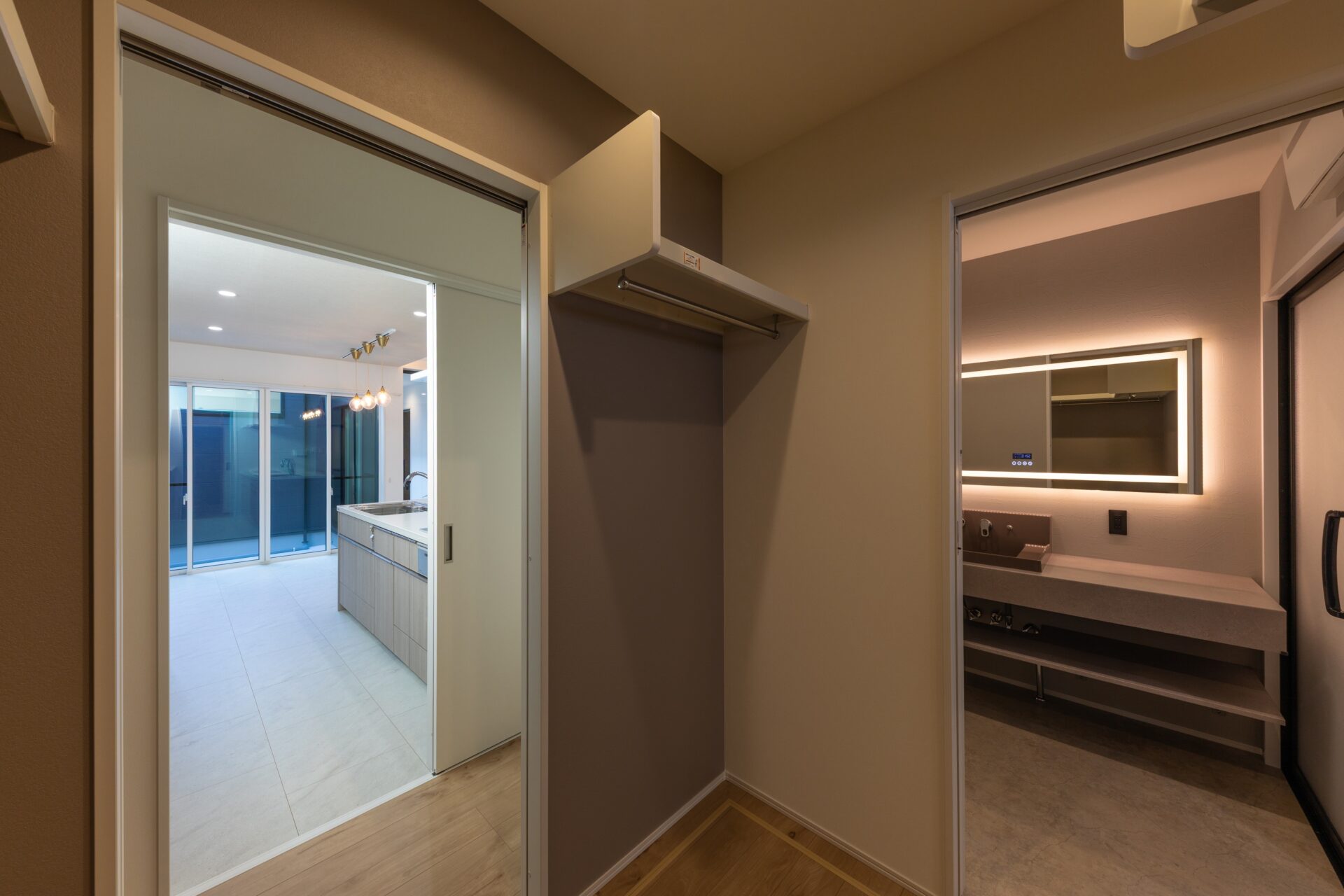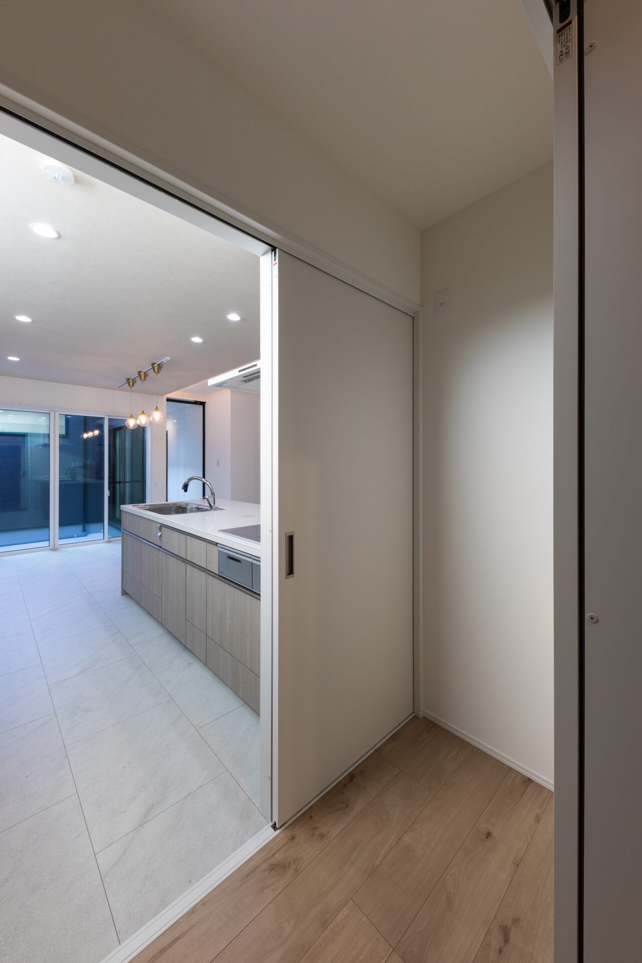 キッチンからパントリー→ファミリークローゼット→ユーティリティと洗面室に繋がっています