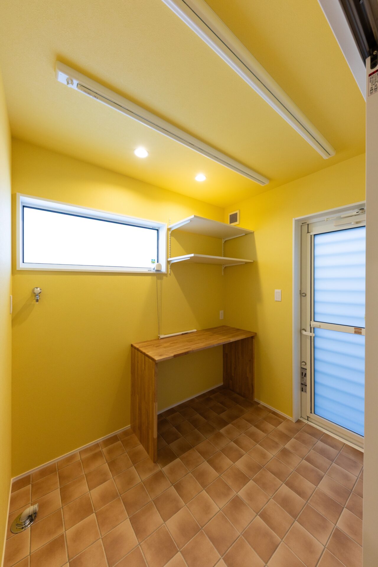 ビタミンカラーとテラコッタのクッションフロアが可愛いユーティリティ