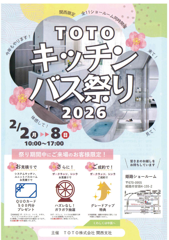 2026年1月14日 / 最終更新日時 : 2026年1月14日 sugahara9069 予約受付中TOTO キッチン・バス 祭り開催!予約受付中!2026年 2月2日(月)~8日(日)までTOTO姫路ショールームにて開催!!お気軽にスタッフまでお問い合わせください!TEL:0120-460-750この機会にぜひご検討ください!FacebookXBlueskyCopyコメントを残す コメントをキャンセルメールアドレスが公開されることはありません。 ※ が付いている欄は必須項目ですコメント ※名前 ※ メール ※ サイト 上に表示された文字を入力してください。 Δ